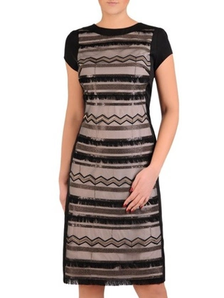Wieczorowa sukienka z ozdobnymi frędzlami 18542, czarna kreacja w paski.