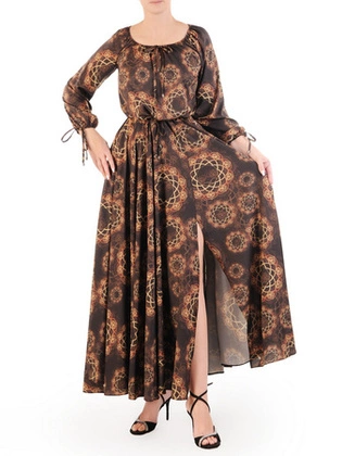 Sukienka damska 17597, długa kreacja w wyszczuplającym wzorze.