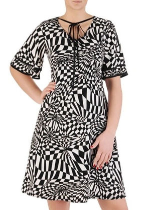Sukienka w geometryczny wzór, luźna kreacja z wiązaniem 19598.