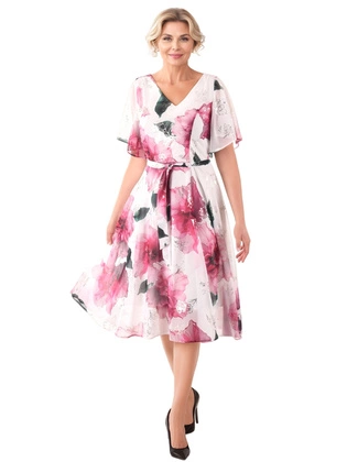 Elegancka sukienka na wesele, komunię – rozkloszowana midi w kwiaty z dekoltem w serek, stylowa i kobieca kreacja 39919