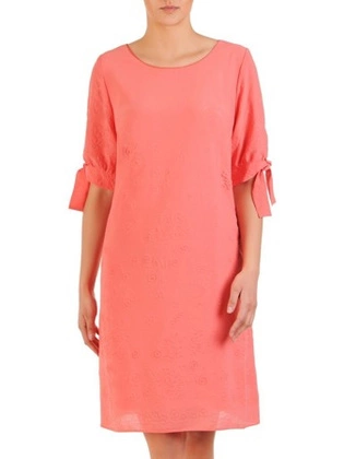 Zwiewna sukienka z szyfonu, koralowa kreacja z ozdobnymi rękawami 29866