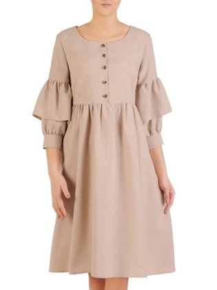 Wizytowa beżowa sukienka z ozdobnymi guzikami oraz falbanami na rękawach 28971