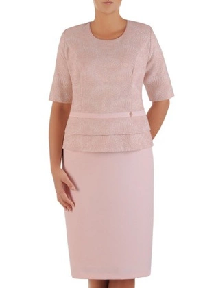 Nowoczesna sukienka z baskinką, kreacja wizytowa z żakardowym topem 22106.
