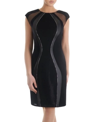 Nowoczesna, czarna sukienka bez rękawów 14163, kreacja z ozdobnymi wstawkami.