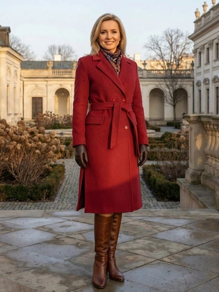 Płaszcz zimowy damski czerwony z alpaki i wełny – elegancki płaszcz z paskiem i kołnierzem 40317