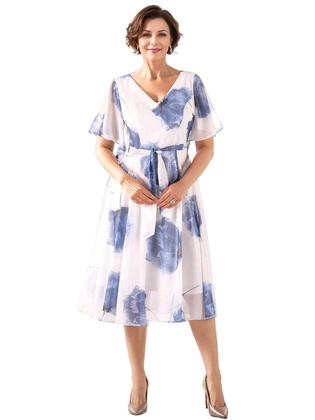 Elegancka sukienka na wesele, komunię – rozkloszowana midi w kwiaty z dekoltem w serek, stylowa i kobieca kreacja 39918