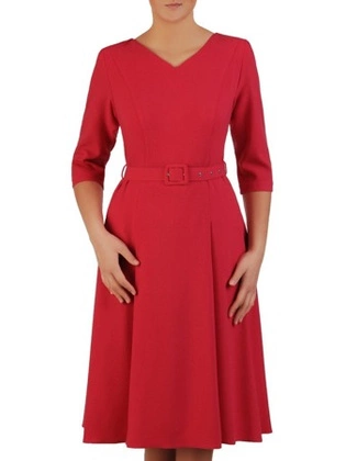 Rozkloszowana sukienka z ozdobnymi kontrafałdami 18608, kreacja z czerwonym paskiem.
