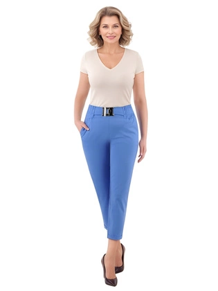 Niebieskie eleganckie spodnie damskie z dzianiny – model z ozdobną klamrą, kieszeniami i mankietami 39560