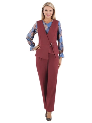 Spodnie damskie bordowe z domieszką wełny – proste eleganckie spodnie wizytowe z kantem i gumką 37226