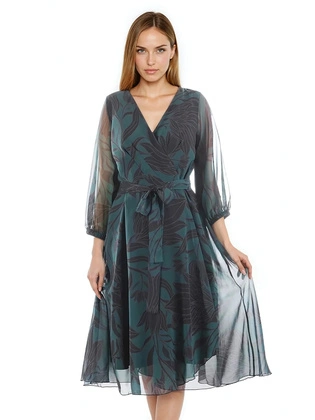 Sukienka wyjściowa, kopertowa kreacja w rozkloszowanym fasonie z paskiem 38672