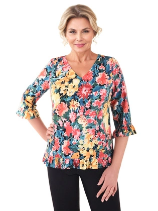 Wzorzysta bluzka damska z falbanami przy dekolcie 35748