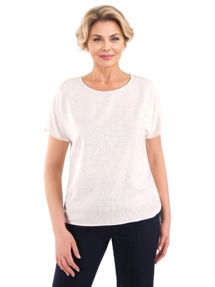 Elegancka bluzka damska z krótkim rękawem – biała z miedzianym wzorem, stylowa i modna 39522