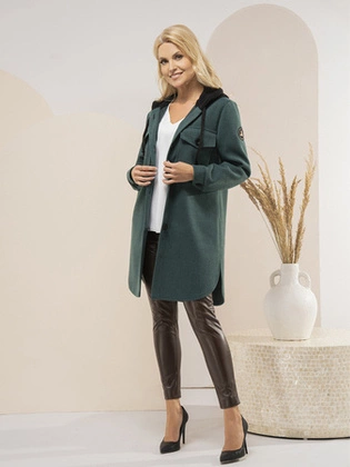 Płaszcz damski z kontrastowym kapturem, zielony, nowoczesny płaszcz zapinany na guziki, duże rozmiary 35808
