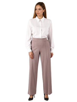 Beżowe spodnie damskie plus size z wysokim stanem – wygodne dzianinowe spodnie z kantem i gumą w pasie 40663