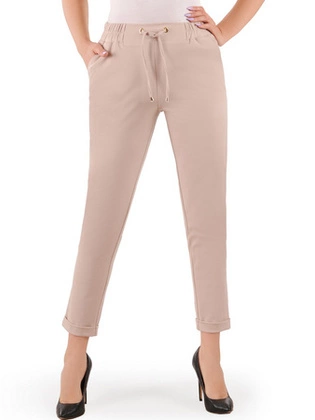 Beżowe eleganckie spodnie damskie z dzianiny – model z ozdobną klamrą, kieszeniami i mankietami 35412