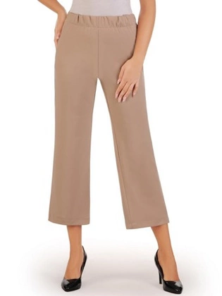 Szerokie spodnie damskie, beżowe, dzianinowe spodnie na gumce, boczne kieszenie, duże rozmiary 27320