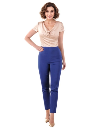 Spodnie damskie, niebieskie spodnie z wiskozy, dopasowane, boczne kieszenie, mankiety, ozdobne wiązanie w pasie 35612