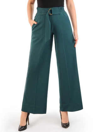 Szerokie spodnie damskie, zielone spodnie w kant z gumką w pasie, bocznymi kieszeniami 34173