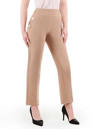 Spodnie damskie, beżowe, proste spodnie z wiskozy na gumce z ozdobnymi guzikami przy kieszeniach, duże rozmiary 35406