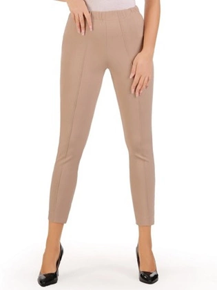 Spodnie damskie, dzianinowe, beżowe spodnie w kant z gumką w pasie, wyszczuplające legginsy, duże rozmiary 27328