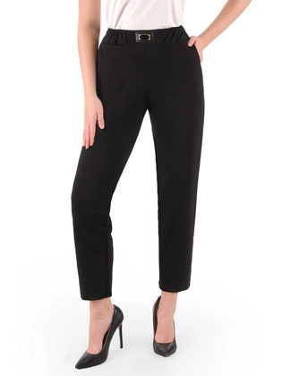 Spodnie damskie, czarne spodnie z wiskozy, dopasowane, boczne kieszenie, mankiety, ozdobne wiązanie w pasie 35410