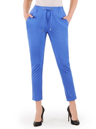 Spodnie damskie, niebieskie spodnie z wiskozy, dopasowane, boczne kieszenie, mankiety, ozdobne wiązanie w pasie 35612