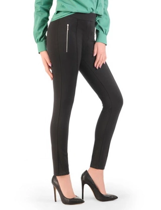 Spodnie damskie, dzianinowe, czarne, dopasowane spodnie z ozdobnymi zamkami 32529