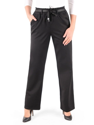 Spodnie z wysokim stanem, czarne spodnie damskie z tkaniny z gumką w pasie i kieszeniami 39037