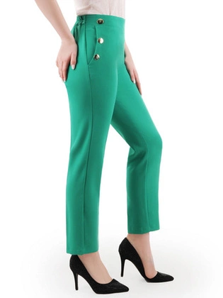 Spodnie damskie, zielone, proste spodnie z wiskozy na gumce z ozdobnymi guzikami przy kieszeniach, duże rozmiary 35402