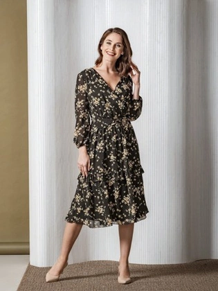 Sukienka z kopertową zakładką, rozkloszowana kreacja w kwiaty 21932