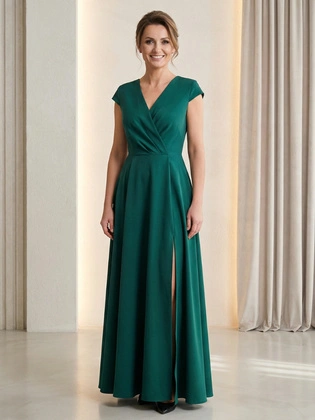 Sukienka damska maxi z kopertowym dekoltem – butelkowa zieleń, rozkloszowana elegancka sukienka na wesele i studniówkę 18619
