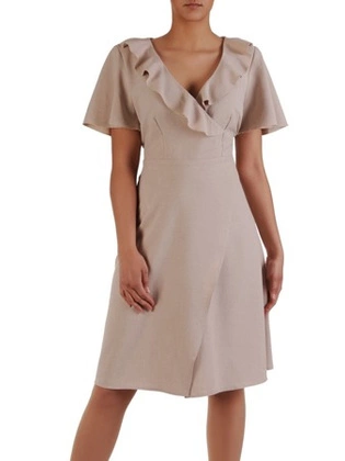 Sukienka z lnu 16568, beżowa kreacja z żabotem.