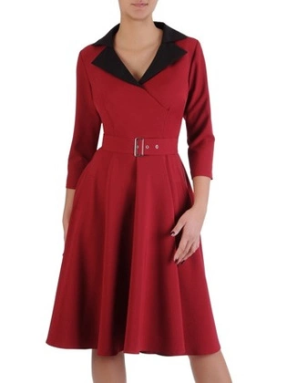 Sukienka bordowa 18350, rozkloszowana kreacja z kieszeniami.