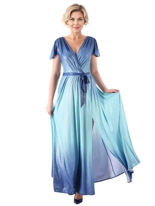 Elegancka sukienka wyjściowa maxi w odcieniach błękitu i granatu – brokatowa dzianina z paskiem i gumką, idealna na wesele 39929