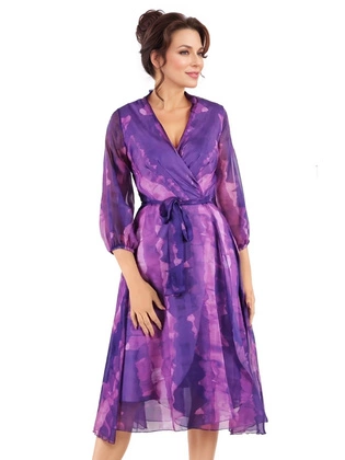Kopertowa sukienka z szyfonu, rozkloszowana kreacja z paskiem 36509