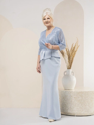 Elegancki komplet damski na wesele dla mamy – granatowa sukienka z białym żakietem i koronką 40091