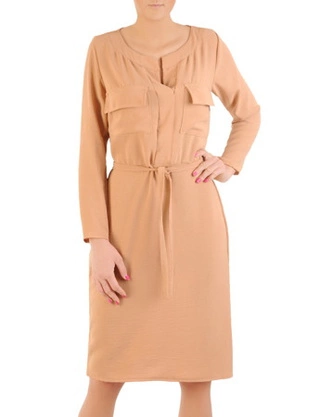 Prosta sukienka z ozdobnymi kieszeniami, beżowa kreacja z paskiem 31956