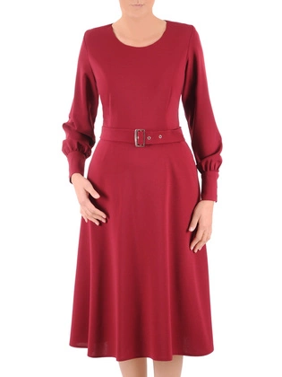 Rozkloszowana sukienka z dzianiny, bordowa kreacja z paskiem 23353