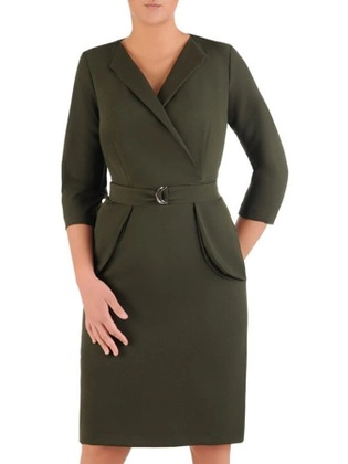 Zielona sukienka z tkaniny, kreacja z ozdobnymi kieszeniami 23163