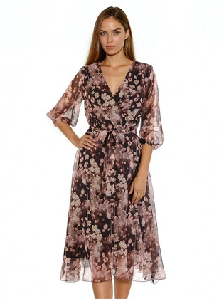 Wizytowa sukienka damska z koronkowym, kopertowym topem 32322