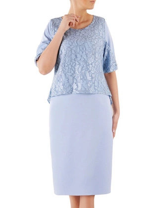 Elegancki pastelowy komplet, prosta sukienka z koronkowym żakietem 30415