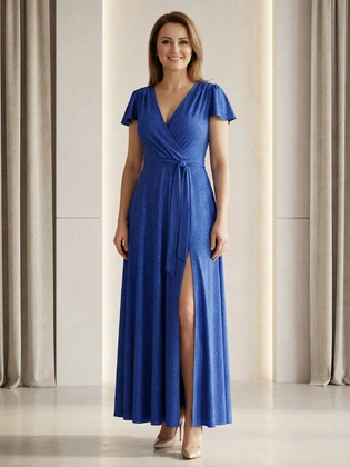 Elegancka suknia maxi na wesele i studniówkę – chabrowa z brokatem, rozcięciem i wyszczuplającym kopertowym dekoltem 34537