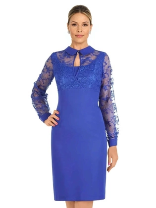 Elegancka sukienka z kołnierzykiem, kreacja z koronkowymi rękawami 32168