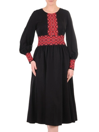 Czarna sukienka z ozdobnymi, czerwonym wzorem 35189
