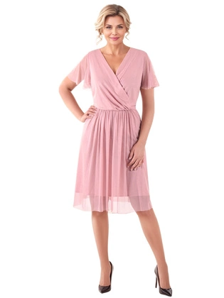 Pudrowo-różowa sukienka midi z tiulu – elegancka sukienka na wesele z kopertowym dekoltem i połyskiem 39888