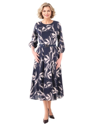 Granatowa sukienka na wesele, komunię – rozkloszowany fason w kwiaty z paskiem podkreślającym talię, elegancka i kobieca kreacja 39628