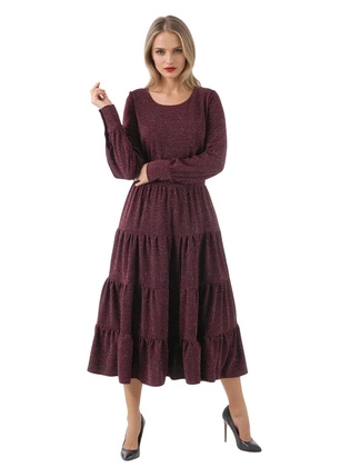 Szyfonowa sukienka z cekinowymi wstawkami, bordowa kreacja z falbaną 37393