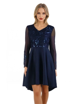 Sukienka z ozdobnymi, szyfonowymi rękawami 14271, granatowa kreacja wieczorowa.