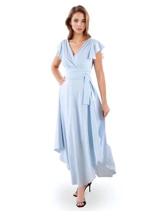 Sukienka na wesele maxi, elegancka błękitna sukienka kopertowa, modny asymetryczny krój 36335