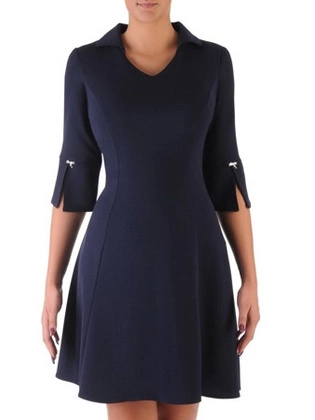 Rozkloszowana sukienka z modnym kołnierzykiem 18117, granatowa kreacja wizytowa.
